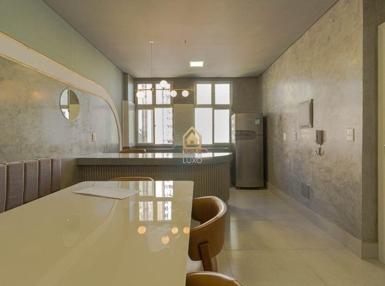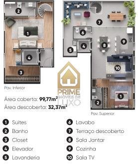 Apartamento: Cobertura de duas suítes. Piso inferior: Uma suíte e escada. Segundo piso: Uma suíte, elevador chegando na sala de Jantar integrada à cozinha americana, lavabo, sala de TV/Estar e terraço descoberto. Área Coberta de 99,77m² e área descoberta de 32,37m² totalizando 132,14m².