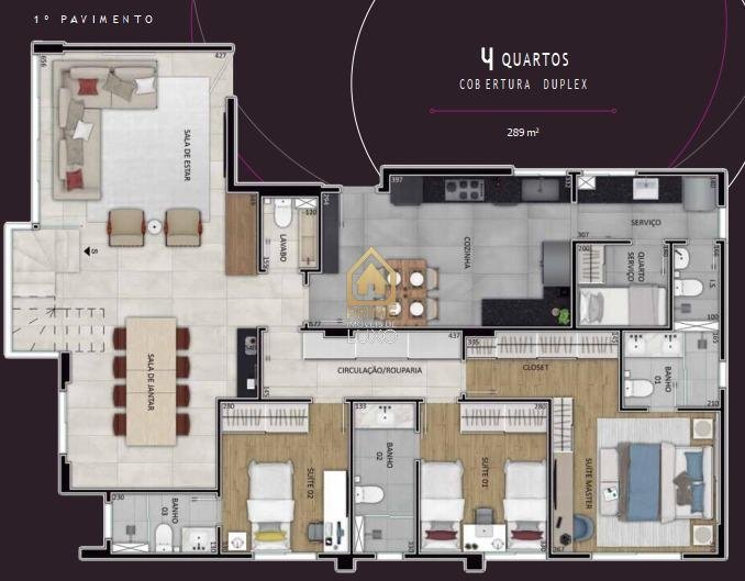 Apartamento: Cobertura de 4 quartos. 1º Pavimento 3 suítes, sala ampla com dois ambientes, varanda, lavado, cozinha com copa, entrada de serviço e área de serviço independente, DCE. 2º Pavimento: 1 quarto, banheiro, trocador, ampla sala e grande terreço descoberto. 4 vagas de garagem.